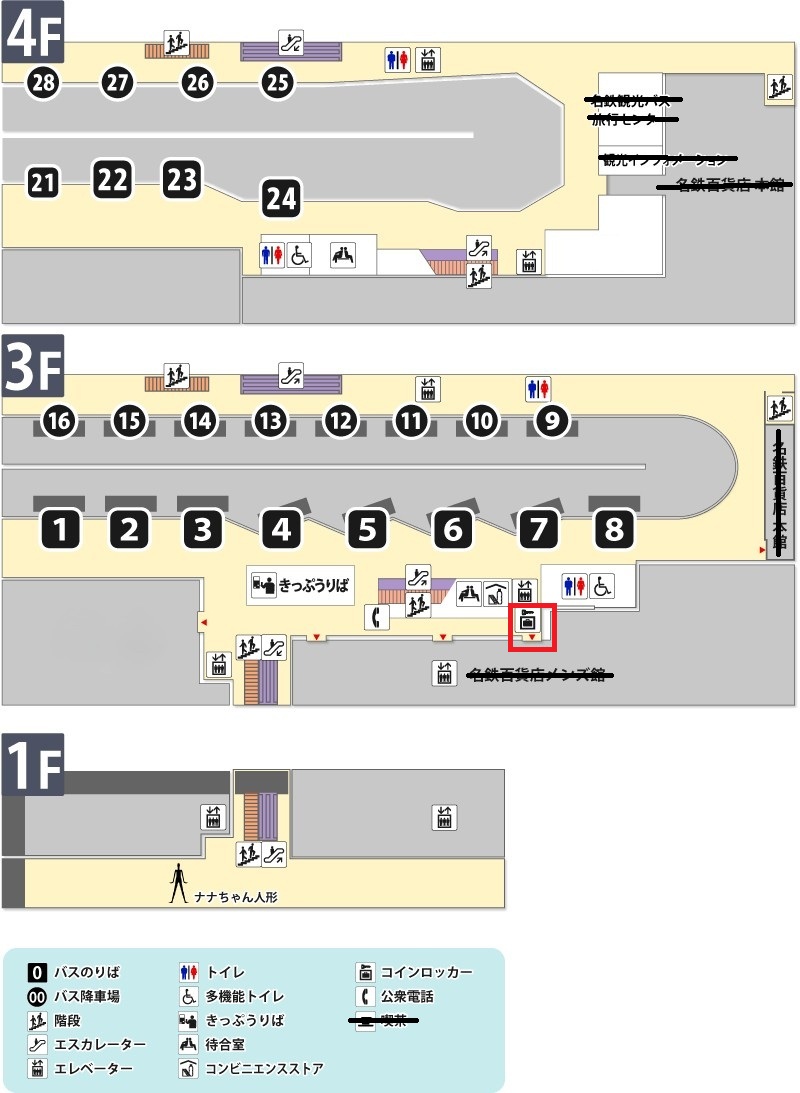 | 名鉄バスセンター | 名鉄南改札外、徒歩3分。土日昼以外空き多め。 | 利用時間5:30-24:00 |
