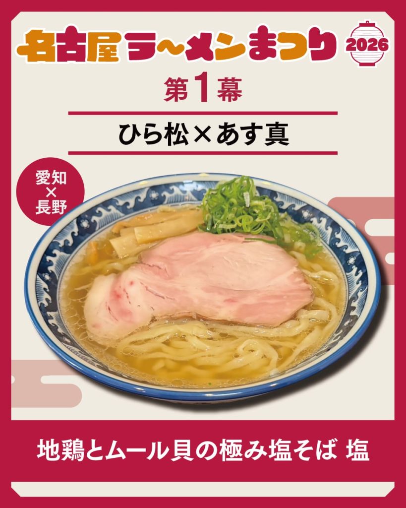 | ひら松 × あす真 | 愛知/長野 | 地鶏とムール貝の極み塩そば 塩 | 塩 | 予約困難店コラボ。貝出汁の極致 |