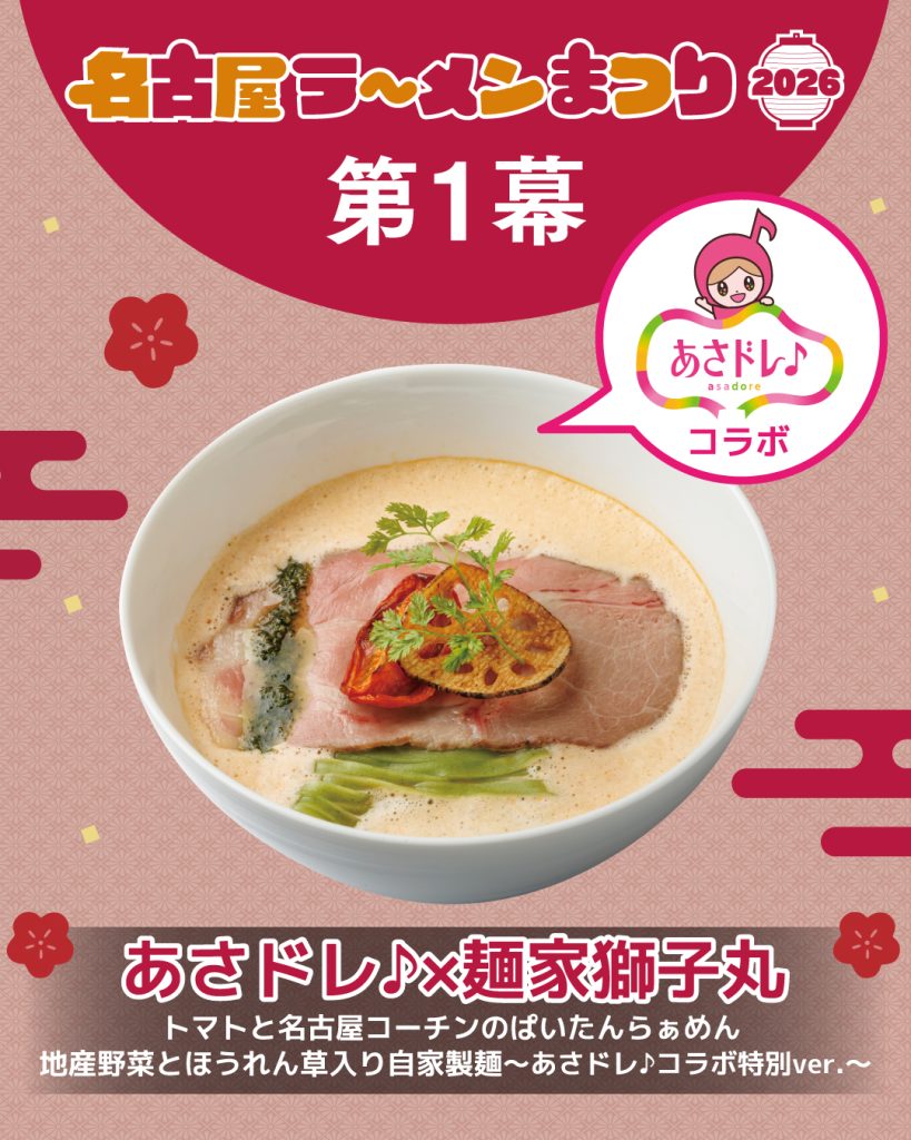 | あさドレ♪ × 獅子丸 | 愛知 | トマトと名古屋コーチンのぱいたんらぁめん | 鶏白湯 | TV番組コラボ。洋風で華やかな味 |