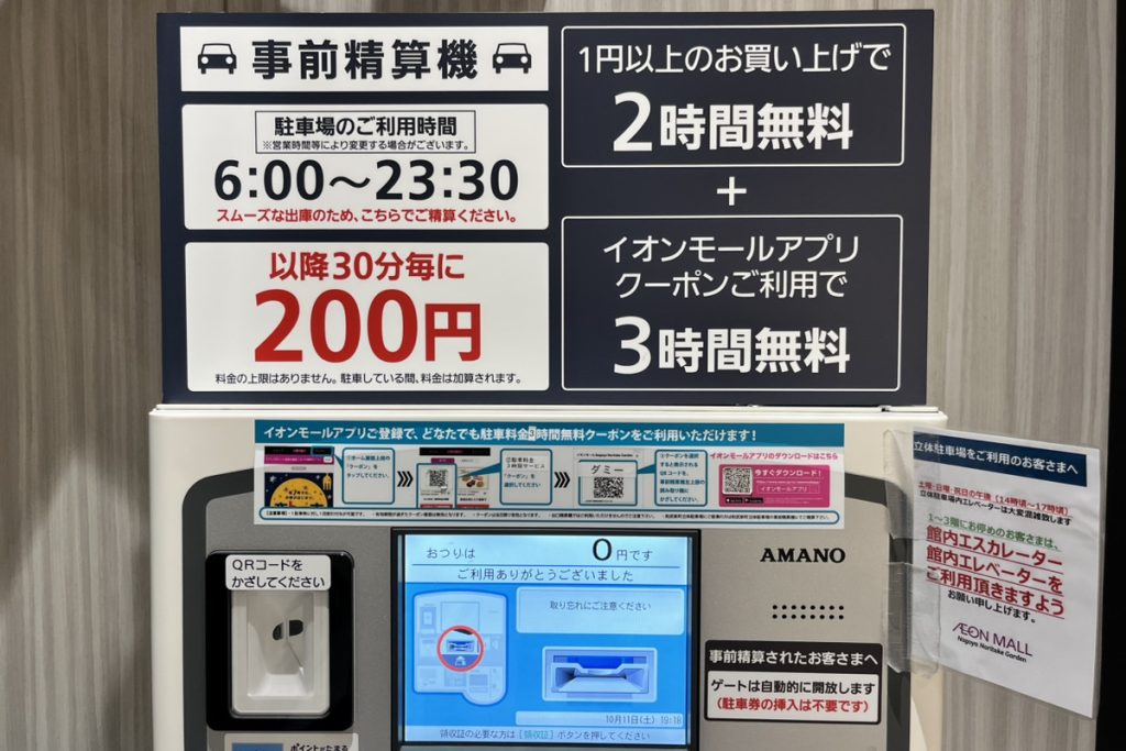 駐車場無料サービスはイオンモールアプリのクーポンにいつでも表示されているので、それを館内事前精算機にかざして利用できます。