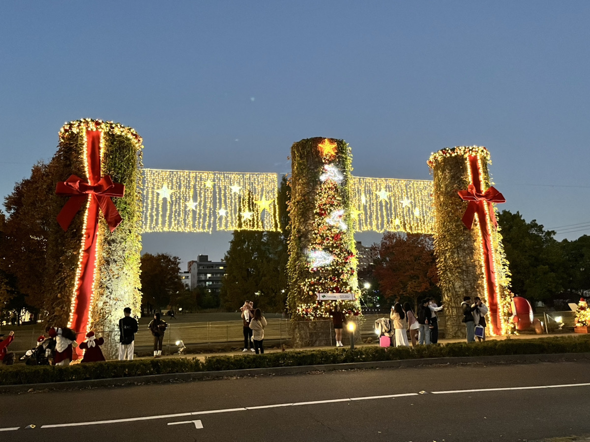 イルミネーション期間中は広い芝生にクリスマスモチーフの大型モニュメントが点在し、フォトスポットもたくさんあるので大勢の人で賑わいます!