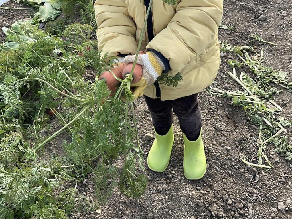 初めて野菜を収穫して、どうやったらいいのかわからずに初めは怒っていましたが、スポッと抜けると面白かったみたいでもっと抜こう!と楽しんでました。