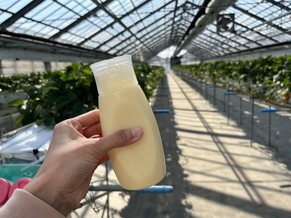 到着してボトルに入った練乳とカップをいただき、いざいちご狩り開始!