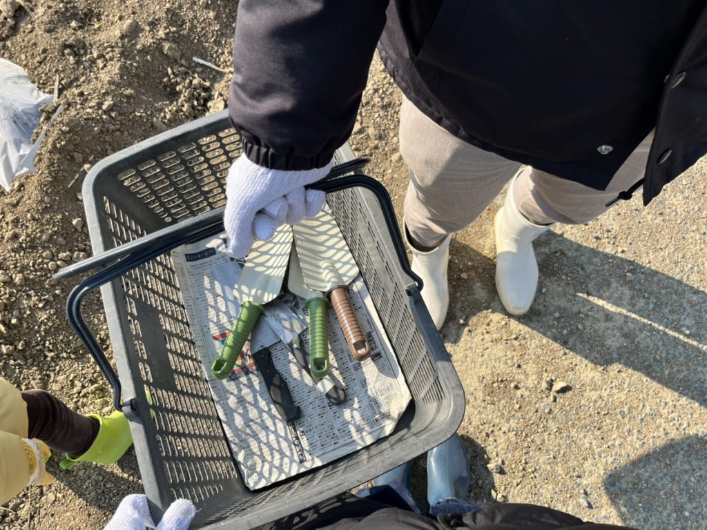 収穫するために軍手、長靴、カゴ、スコップなどを借りていざ収穫!