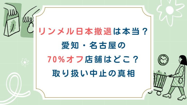 今回は『リンメル日本撤退は本当?愛知・名古屋の70%オフ店舗はどこ?取り扱い中止の真相』について紹介しました。